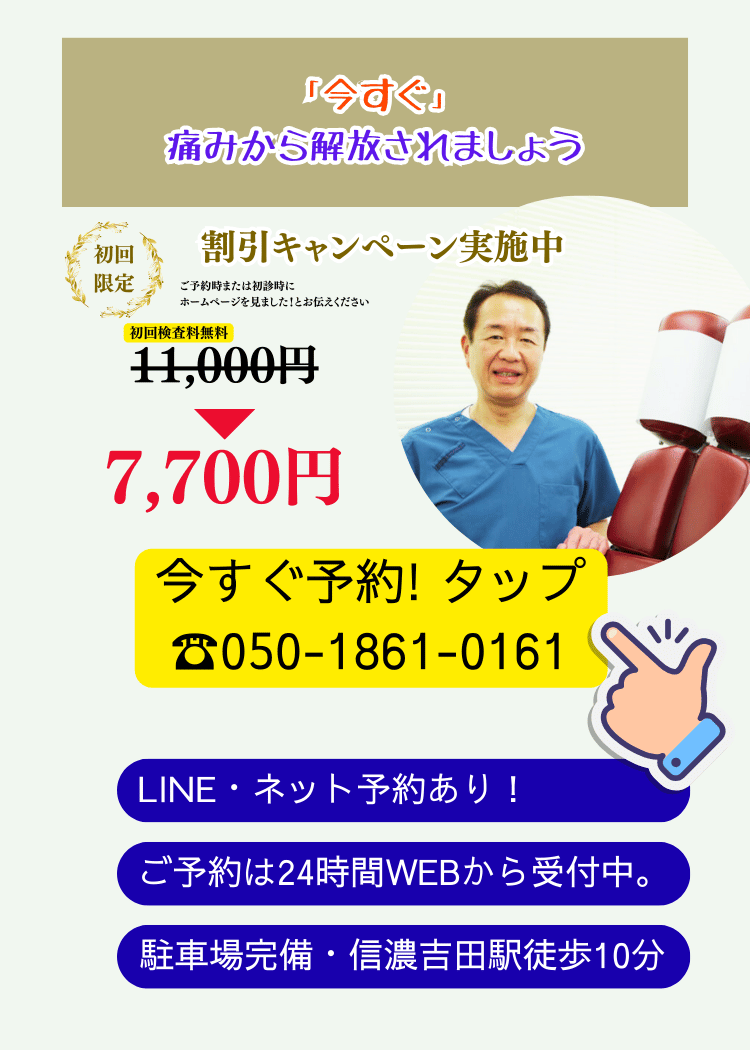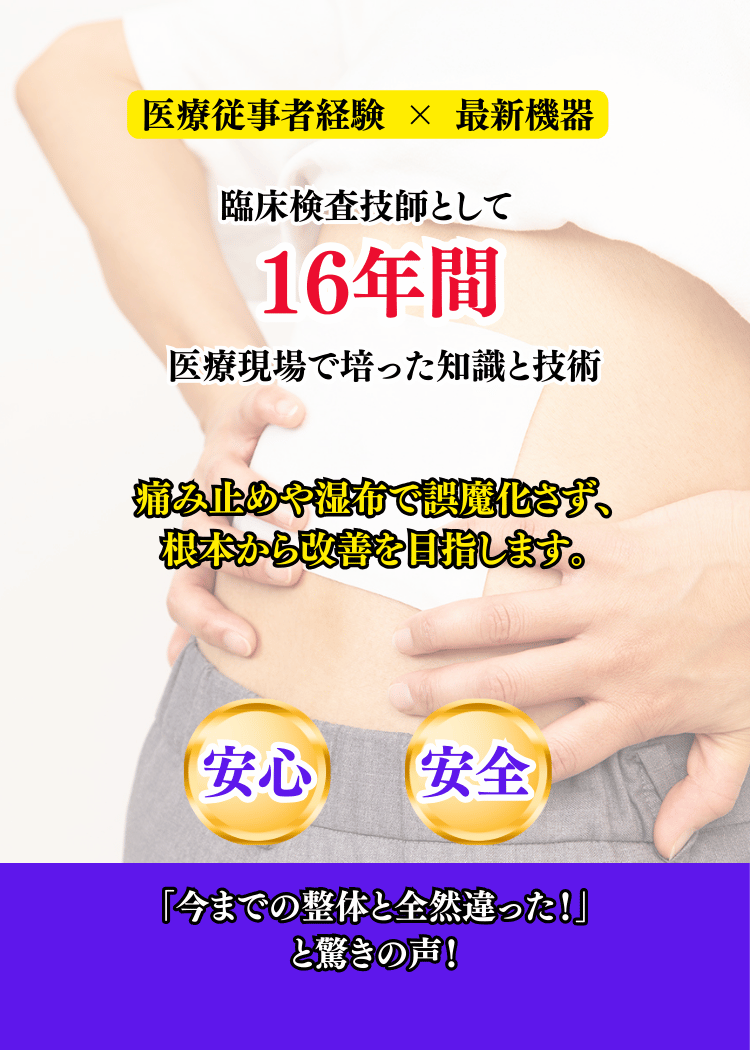 | 施術者 | 医療従事者資格保有・16年間の医療機関経験 | 整体師・柔道整復師 |